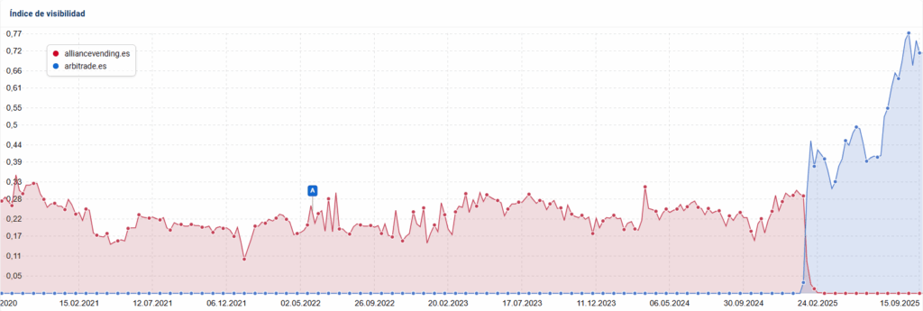 Una de las claves fue preparar el terreno con un año de antelación. Desplegamos una web explicativa en el dominio arbitrade.es que actuó como puente entre ambas marcas. Durante meses, enviamos señales a Google que conectaban el legado de Alliance Vending con el futuro de Arbitrade, reforzando el vínculo semántico y la continuidad de marca a ojos del buscador.