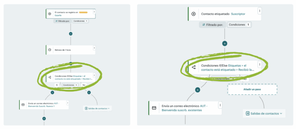 - Journey Suscriptores Existentes: Este flujo se activa si el contacto se vuelve a suscribir y ya está etiquetado como «Suscriptor». En lugar de enviar un cupón duplicado, se envía un correo electrónico explicando por qué no se envía el cupón, mejorando la experiencia del cliente al darle contexto.